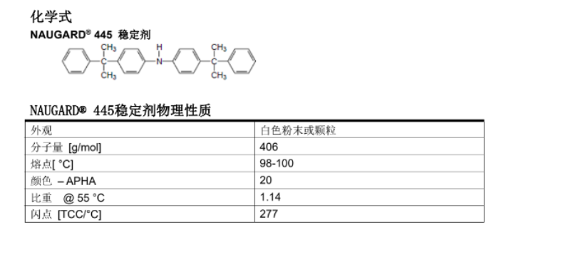 Naugard ?445是二苯胺類高效抗氧劑、熱穩(wěn)定劑、橡膠防老劑,有效保護(hù)塑料及橡膠等免受熱和氧的破壞。
